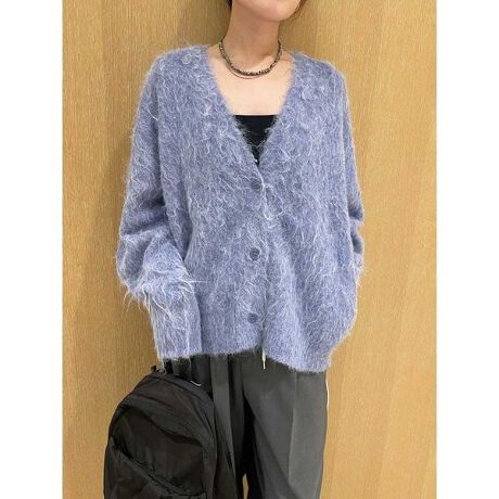 ふわふわのシャギー感がポイントのニットカーデは、昨年よりも軽い糸に変更し軽量化に成功。