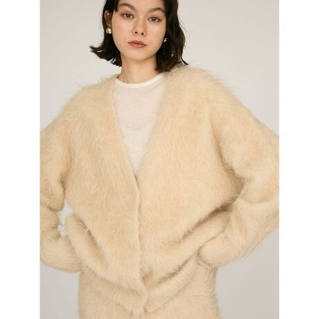 ふわふわのシャギー感がポイントのニットカーデは、昨年よりも軽い糸に変更し軽量化に成功。