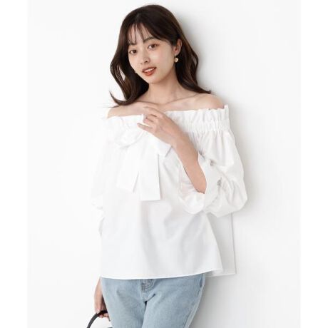 フロントのリボンをポイントに、オフショルダーとしても着られるフリルブラウスです。ボリューミーなシルエットで華やかさを演出。襟まわりと袖口にゴムが入っているので着やすくなっています。