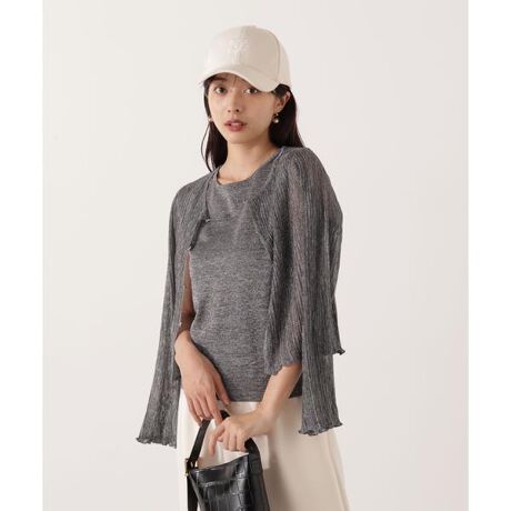 涼しげなシアーラメ糸を使ったオトナ可愛いニットアンサンブルです。インナーはしっかりした編地にし、透けにくいようにしています。リブカーディガンはシンプルな留め具がポイント。それぞれ編地を変えることで単調にならず、オトナな雰囲気で着ていただけます。