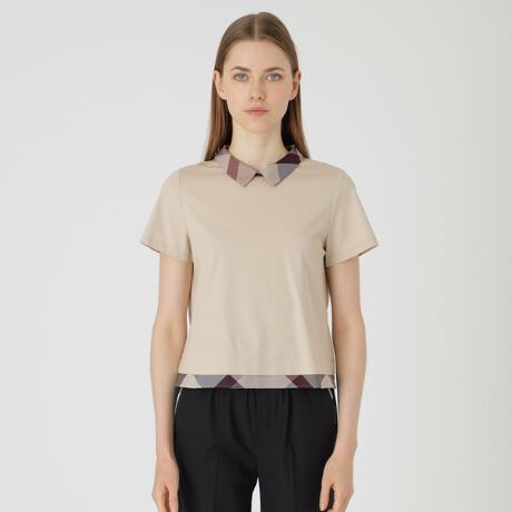 [型番:55P27615__]◆プレッピーなレイヤードライクトップス【Design】クレストブリッジチェックのシャツをレイヤードしたようなコンビデザインのカットソーです。スカート、パンツ共にボトムを選ばずコーディネートいただけます。ヘルシーでプレッピーなブルーレーベルらしいアイテムです。