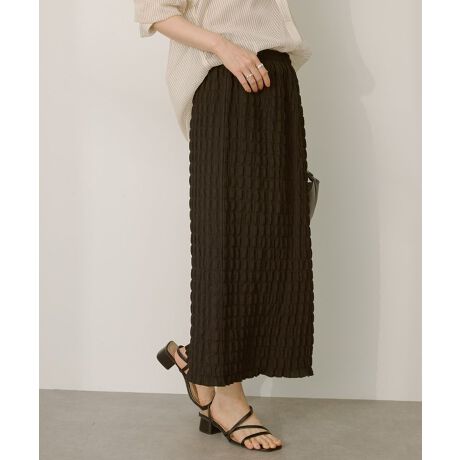 ポコポコとした生地がお洒落なナロースカート。身体のラインを拾いすぎないサイズ感で穿き心地良く、足を真っ直ぐに美しく魅せてくれます。総ゴムのウエストとバックスリット入りで快適な着用感も魅力的。合わせ方次第でロングシーズン活躍するおすすめのアイテムです。透け感[ややあり]