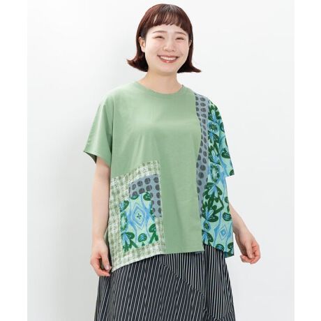 左右アシンメトリーが特徴のプルオーバーはカットソーと布帛素材を3種類ミックスして作りました。