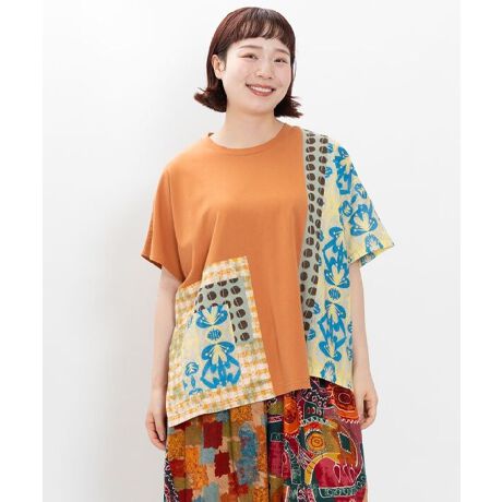 左右アシンメトリーが特徴のプルオーバーはカットソーと布帛素材を3種類ミックスして作りました。