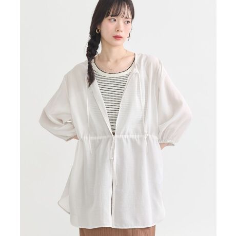 トレンドのシアー素材で仕立てたシャツ。ウエスト部分のドロスト仕様でお好みのフォルムに変えられるのも魅力的です。バックはリボンで結び、インナーを覗かせた抜け感のあるレイヤードスタイルが完成。腰回りをカバーしてくれる長めの着丈でスタイルアップ効果も期待できるおすすめのアイテムです。透け感[ややあり]