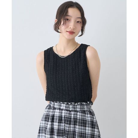 ポコポコとした表情のストレッチレースでフェミニンに仕立てたタンクトップ。ベーシックなフォルムでどんなボトムとも着合わせしやすく、一枚で華やかな雰囲気を演出します。伸縮性のある素材で快適な着心地なのも嬉しいポイント。シャツやジャケットのインナーとしても活躍する汎用性の高いアイテムです。透け感[ややあり]