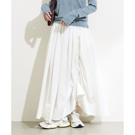 その日の気分でアシンメトリーにあげてみたりできる遊び心あるスカートです。