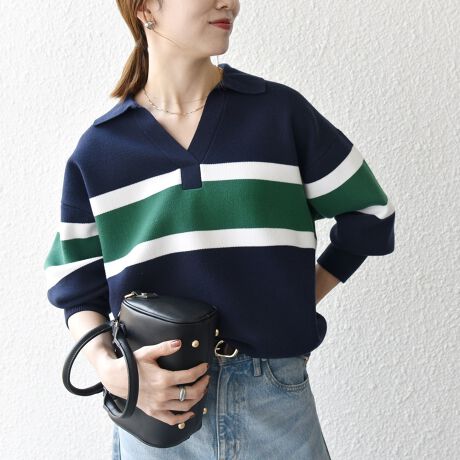 太めの配色ラインが目を惹く、ラガーシャツ風のV開きニット。