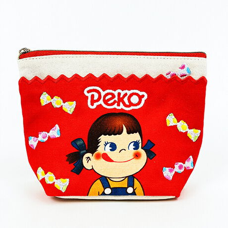 ペコちゃんとミルキーキャンディがデザインされているポーチです。正面はポケットになっているのがポイント♪コンパクトな舟形ポーチなので使いやすい!