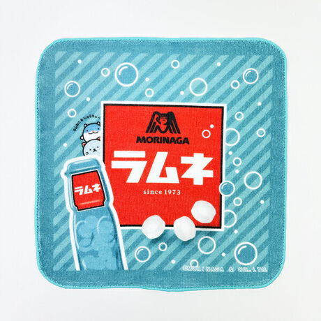 40年以上も愛され続ける、身近なおやつの大定番の「森永ラムネ」身近なハンドタオルに!ひょっこりとラムねこ&しゅうチューがのぞいていてかわいいです。