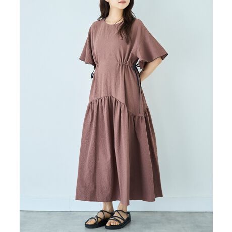 ブラウンにブラックの組み合わせが、大人可愛いです。横のリボンで微調整ができるので体型に合わせて着られそうです。生地は薄めでサラサラしてるので、暑いには涼しく着れました。