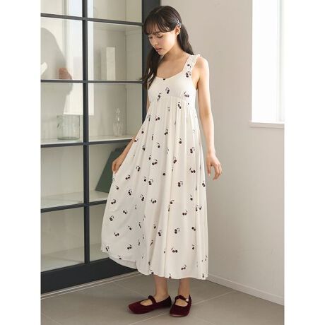ダークチェリー柄をテーマにしたルームウェアシリーズ。なめらかなレーヨン素材のワンピースに、深みのあるダークチェリー柄を散りばめています。揺れ動くチェリーや、艶やかな実の表情にもこだわった大人可愛い質感。肩や胸元にはギャザーを寄せ、華やかな表情をプラスしました。カップ入りなので1枚でも着用いただけます。色はオフホワイトとピンクの2色をご用意。同シリーズのチェリー柄雑貨と合わせたり、同時期に展開するクロシェショートカーディガンとのコーディネートもおすすめです。