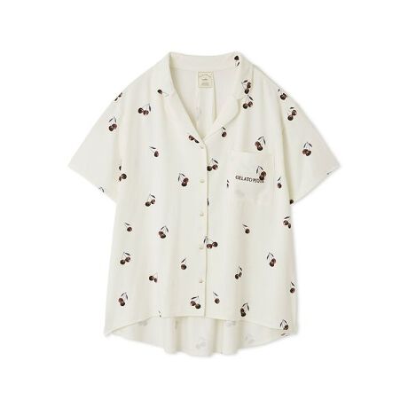 ダークチェリー柄をテーマにしたルームウェアシリーズ。なめらかなレーヨン素材の半袖シャツに、深みのあるダークチェリー柄を散りばめています。揺れ動くチェリーや、艶やかな実の表情にもこだわった大人可愛い質感。胸ポケットにはロゴ刺繍も入れました。色はオフホワイトとピンクの2色をご用意しています。同シリーズのチェリー柄パンツや雑貨と合わせてお楽しみください。