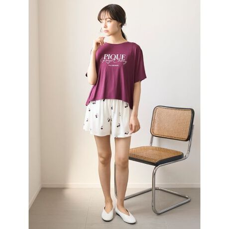 ダークチェリー柄をテーマにしたルームウェアシリーズ。なめらかなレーヨン素材のショートパンツに、深みのあるダークチェリー柄を散りばめました。揺れ動くチェリーや、艶やかな実の表情にもこだわった大人可愛い質感。フリルを入れたウエストシャーリングもポイントです。両脇にポケットを付け、腰元にはロゴ刺繍も入れました。色はオフホワイトとピンクの2色をご用意。同シリーズのチェリー柄シャツやTシャツ、雑貨と合わせてお楽しみください。
