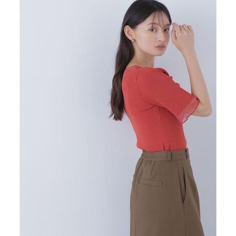 襟ぐりと袖口のさりげないシアー切り替えがポイントのリブニット。身頃と袖は透けないリブで編み立てることで、シアーで涼しげな雰囲気がありつつ、1枚で着られるデザインです。スカートもパンツも合わせやすく、キレイな印象でオンオフどちらのシーンでも着ていただけます。<素材>さらっとした風合いのハイゲージニット糸を使用しています。<詳細>仕様・開閉なし裏地・なし透け感・なし / 光沢・シアー部分はややあり / 伸縮性・あり生地の厚さ・普通※モデルの着用画像の場合、光の当たり具合により、実際の色味と異なって見えることがございます。色味は、商品単体の画像をご参照ください。