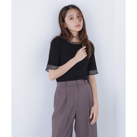 襟ぐりと袖口のさりげないシアー切り替えがポイントのリブニット。身頃と袖は透けないリブで編み立てることで、シアーで涼しげな雰囲気がありつつ、1枚で着られるデザインです。スカートもパンツも合わせやすく、キレイな印象でオンオフどちらのシーンでも着ていただけます。<素材>さらっとした風合いのハイゲージニット糸を使用しています。<詳細>仕様・開閉なし裏地・なし透け感・なし / 光沢・シアー部分はややあり / 伸縮性・あり生地の厚さ・普通※モデルの着用画像の場合、光の当たり具合により、実際の色味と異なって見えることがございます。色味は、商品単体の画像をご参照ください。