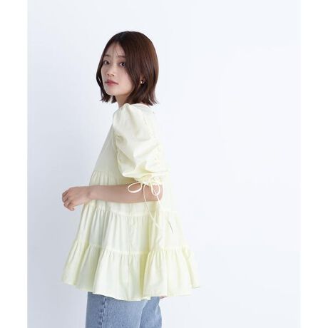 ボリューミーなティアードデザインがポイントのブラウス。ギャザーを寄せたパフスリーブの袖口には共布リボンをあしらい、フェミニンな雰囲気に仕上げています。今季トレンドのティアードデザインを取り入れたチュニック丈は、細身のパンツと合わせたり、デニムパンツと合わせてカジュアルダウンするのもオススメです。<素材>程よくハリ感のあるブロード素材を使用しています。<詳細>仕様・後ろボタン裏地・なし透け感・なし / 光沢・なし / 伸縮性・なし生地の厚さ・普通※モデルの着用画像の場合、光の当たり具合により、実際の色味と異なって見えることがございます。色味は、商品単体の画像をご参照ください。