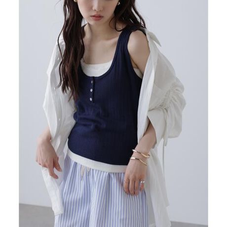 針抜きテレコのタンクトップを2枚重ねたレイヤードデザイン。表面と裏面はアームホールでドッキングしています。ボトムスにINしなくても着られるよう裾はテールカーブをつけていたり、胸元のボタンをオープンにできるスキッパーデザインもポイント。カジュアルなパンツやプリーツスカートを合わせ、Y2Kらしいスタイリングがおススメです。※モデルの着用画像の場合、光の当たり具合により、実際の色味と異なって見えることがございます。色味は、商品単体の画像をご参照ください。