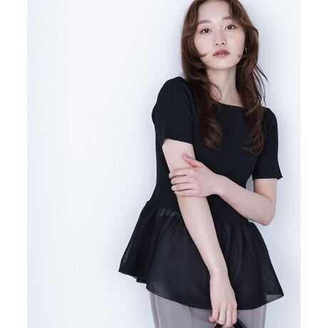 裾まわりのシアーペプラムデザインがポイントのニットプルオーバー。ボディ部分はリブ編みでフロントに編地のラインを入れることで、すっきりとしたシルエットを演出。ペプラム部分はシアーの糸を使用し、ボリューム感のあるペプラムシルエットに拘ったデザインです。ナロースカートや細身のパンツ合わせで、スタイリッシュなスタイリングがおすすめです。<素材>ボディは清涼感のあるタッチのポリエステル糸でリブ編みに編み立てています。ペプラム部分はクリアなシアー糸を使用しています。<詳細>仕様・開閉なし裏地・なし透け感・ボディはなし、裾はあり / 光沢・ボディはなし、裾はあり / 伸縮性・あり生地の厚さ・普通※モデルの着用画像の場合、光の当たり具合により、実際の色味と異なって見えることがございます。色味は、商品単体の画像をご参照ください。