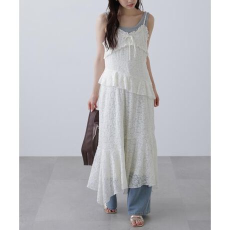 イレギュラーヘムとアシンメトリーなラッフルがトレンドライクな総レースのキャミワンピース。ボディラインをきれいに見せてくれるシルエットと、歩くたびに揺れる裾とラッフルがポイントです。ミニフリルでアクセントをプラスし、バスト下切り替えでウエストラインをスッキリ見せてくれます。ストレッチフラワーレースが軽やかな印象で、伸縮性があるので着心地も◎。レイヤードコーデにもおすすめです。インナー次第でオールシーズン活躍。1枚でさらりと着たり、デニム合わせもおすすめです。ウエスタンブーツなど、足元にボリュームのあるアイテムと合わせて、甘辛ミックスなスタイリングも楽しめます。脇開きファスナー付き。※モデルの着用画像の場合、光の当たり具合により、実際の色味と異なって見えることがございます。色味は、商品単体の画像をご参照ください。