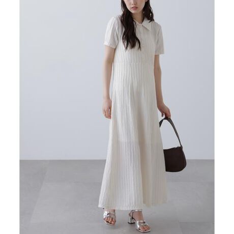 波線のような表面感のあるカットジャガード素材のワンピース。ウエスト脇をシェイプさせ、縦に柄が流れるライン使いでスタイルアップして見えます。トレンドのポロ襟にし、スカート部分はやや裾が広がるマーメイドシルエットで、カジュアルすぎない印象に。足元はサンダルを合わせ、第一ボタンを開けてスキッパーのように抜け感を出した着こなしがおすすめです。スカート部分は裏地つき。※モデルの着用画像の場合、光の当たり具合により、実際の色味と異なって見えることがございます。色味は、商品単体の画像をご参照ください。