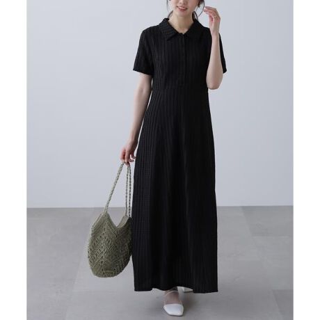 波線のような表面感のあるカットジャガード素材のワンピース。ウエスト脇をシェイプさせ、縦に柄が流れるライン使いでスタイルアップして見えます。トレンドのポロ襟にし、スカート部分はやや裾が広がるマーメイドシルエットで、カジュアルすぎない印象に。足元はサンダルを合わせ、第一ボタンを開けてスキッパーのように抜け感を出した着こなしがおすすめです。スカート部分は裏地つき。※モデルの着用画像の場合、光の当たり具合により、実際の色味と異なって見えることがございます。色味は、商品単体の画像をご参照ください。