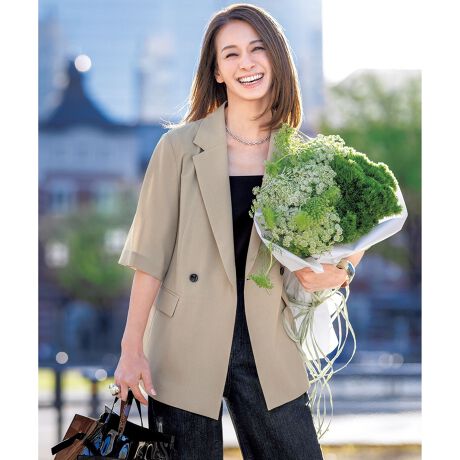 ■デザインリネンライクな素材が、見た目も着心地も涼しいハーフスリーブジャケット。ジャケットのきちんと感、シャツのような軽やかさを兼ね備えたデザインに仕上げました。リラックスしたシルエットなので、オンでもオフでも気負わず着られる1枚です。デイリーからオケージョンまで、合わせるアイテムやシーンを問わず着用いただけます。同素材のパンツやオールインワンとのセットアップもおすすめです。