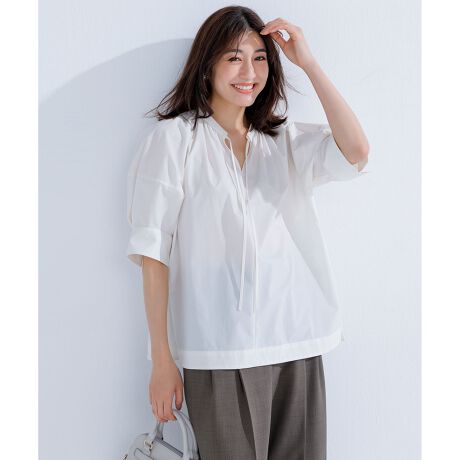 ■デザインボリュームのあるランタンスリーブが1枚で映えるデザインブラウス。甘めのデザインにスキッパー開きと広めのカフスで抜け感をプラス。機能素材ながら、きれいめのデザインなのでシーンを選ばず着用いただけます。