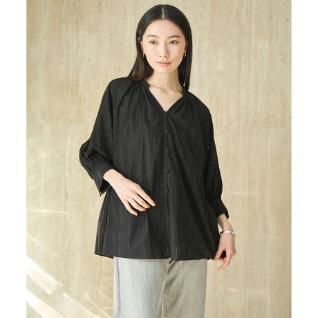 ■デザイン繊細なレースとボリューム感が贅沢なブラウス。首元はスッキリ仕上げており、透け感のある軽やかな素材で、甘い印象になりすぎず大人の女性らしく着られる一枚です。前を開けると、羽織としてもご着用いただけます。シンプルなボトムスと合わせても、さり気なくコーディネートに鮮度をプラスできます。フロントのくるみ釦もポイントです。
