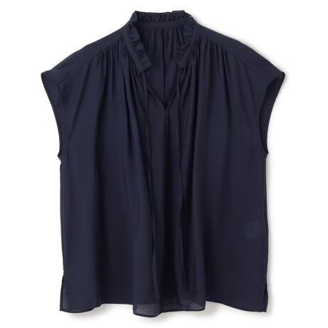 フリルとギャザーで女性らしい印象のノースリーブブラウス