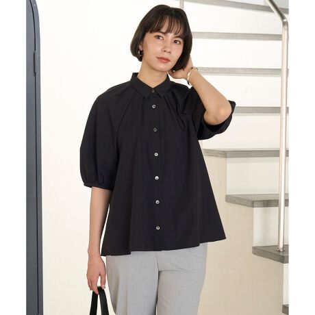 ■デザインランタンスリーブがポイントのデザインブラウス。ボリュームがありながらも落ち感のある素材で、女性らしく決まるブラウスです。コンパクトな襟がきちんとした印象ですが、ボタンを開けると甘さを少し抑えた印象にもなります。ヒップにかかる着丈なので、パンツとも相性が良くすっきりと着こなせます。ワイドパンツには、トップスインスタイルで合わせるのもおすすめです。