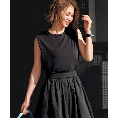 ■デザインサラサラとした強撚糸を使用した、フライス編みのノースリーブトップス。きちんと見えするネックラインや、肩先のダブルタックがポイントです。ノースリーブながら、肩先のタックがお袖をカバーしてくれます。もたつかない素材感なので、ウエストインでもアウトでも、ごわつかずにすっきりとした印象になります。ボトムを選ばずに着て頂ける万能アイテムです。1枚でも、カーデやシャツなどのインナーアイテムとしても活躍します。