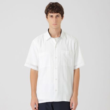 トレンドのシアー感のあるハーフスリーブシャツです。シャリ感があり、サラッとした着心地で、夏でも快適に着用していただけます。Tシャツの上からでも羽織りやすくする為、少しだけサイズ感を大きめに設定しています。夏のコーディネートの主役にもなる一着です。