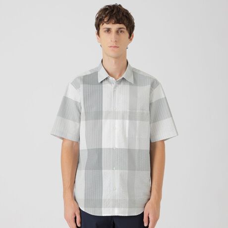 素材にはポリエステル混のサッカー素材を使用しています。細番手のコットンとポリエステルを使用し、クレストブリッジチェックを大柄で織り上げています。生地表面の凹凸により肌との隙間が生まれ、湿気の多い日でも快適に着用いただける夏の定番の素材です。