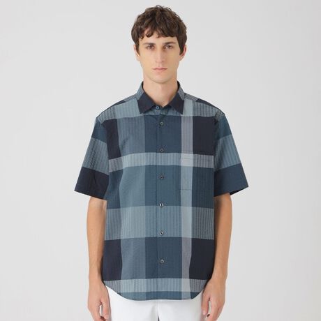 素材にはポリエステル混のサッカー素材を使用しています。細番手のコットンとポリエステルを使用し、クレストブリッジチェックを大柄で織り上げています。生地表面の凹凸により肌との隙間が生まれ、湿気の多い日でも快適に着用いただける夏の定番の素材です。
