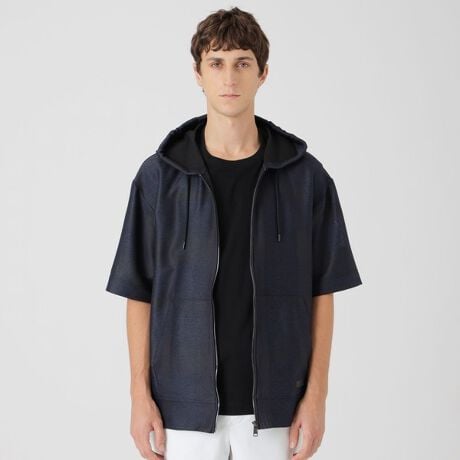 全面にシャドーのチェック柄をあしらった半袖パーカー。メランジ調のカラーリングと程良いハリ感によりオトナなテイストのパーカーになっています。光沢感あるファスナーなど細かな部分までこだわった一着です。