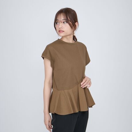 クリアでクリーンな表面感のカットソー素材と裾をセミシアーのテキスタイルで切り替えたペプラムシルエットのプルオーバーです。