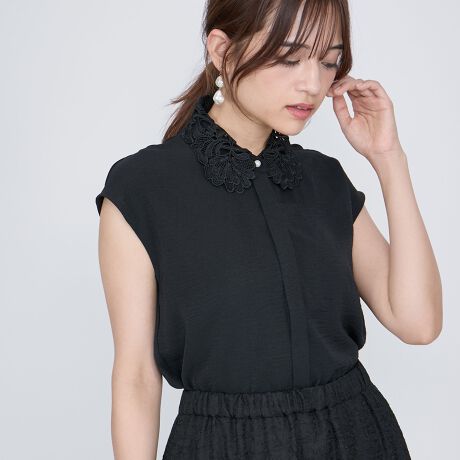 UVカット、接触冷感機能を備えたテキスタイルを使用したレースカラーの比翼ブラウスです。