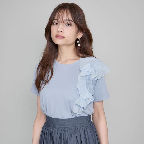 コサージュ感覚でアシンメトリーに配置されたフリルデザインがポイントのドレスTシャツです。