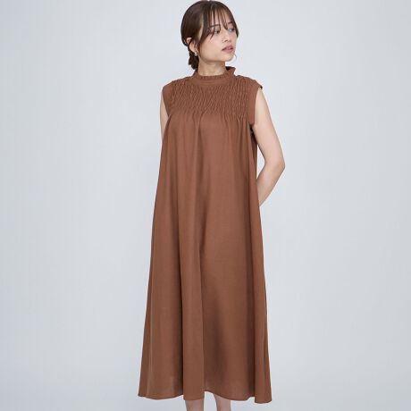 麻のもつドライな質感とレーヨンの滑らかな肌触りが組み合わさり、夏でも快適にご着用いただけるテキスタイルを使用したシャーリングデザインのワンピースです。