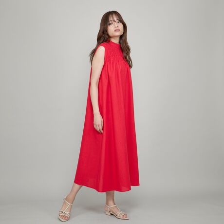 麻のもつドライな質感とレーヨンの滑らかな肌触りが組み合わさり、夏でも快適にご着用いただけるテキスタイルを使用したシャーリングデザインのワンピースです。