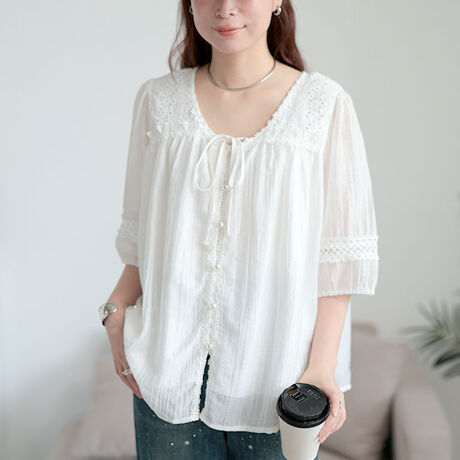 繊細な刺繍レースと軽やかなストライプドビーが魅力のブラウスです。肩部分や胸元に施された花柄刺繍が上品で女性らしい印象。パールボタンとリボン紐のディテールが女子心をときめかせるデザイン。ふんわりと丸みのある袖が柔らかなシルエットを生み可愛らしさを引き立てます。薄手ながらも裏地がついており、涼しさと安心感を両立。透け感のあるホワイトカラーが清潔感を引き立ててくれます。カジュアルにもフェミニンにも合うので、スタイリングも自由自在。着るだけで「可愛い」と思わず微笑んでしまう特別な一枚です☆