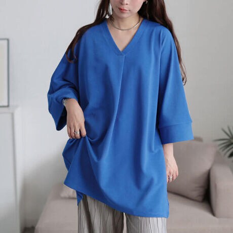 美人見えする絶妙ゆる感、接触冷感Vネック胸タックチュニックが登場☆体型を拾わないゆとりのある身幅でストレスフリーな着心地◎ぽっちゃりさんの気になるお腹&ヒップがすっぽり隠れる長めの着丈で体型カバー力も抜群です☆Vネックと胸元タックが作る縦ラインでスッキリとしたシャープな印象を作り出し、胸元タックでゆとりを作る事で大きめバストの方も窮屈感なくご着用いただけます◎ひんやりとした肌触りが心地良い、伸縮性に優れた接触冷感生地で蒸し暑い季節も快適です◎