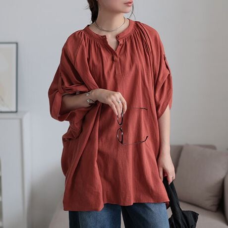 トレンド感満載なオーバーシルエットで、リラックスムード漂うプルオーバーブラウス。首元のギャザーが女性らしさを演出し、ロールアップ用のボタンが付いたスリーブだから、気分によって着こなしを変えられ、首元は比翼ボタンですっきり見えする一枚。ゆったりと軽やかな着心地に、ドルマンスリーブで体型を拾わず、安心丈でヒップラインまでしっかりカバー。レイヤードもしやすく、首元にボタン付きだから着脱も楽々。コットン生地だから通気性も良く、汗ばむ季節も快適な着心地に。シボ感のある生地がこなれ感漂う印象をプラス。