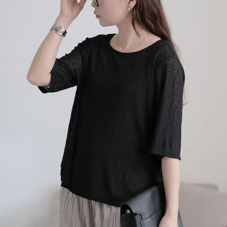 総レースが女性らしいエレガントさをアピールストレッチレースクルーネックプルオーバーの登場です。繊細なレースをたっぷり使った上品さを感じる一枚。着心地はもちろん見た目にも軽やかな透け感が暑い季節にぴったり。肘にかかる少し長めの袖丈は二の腕・肘をカバーし上品な女性らしさを醸し出します。トップスとしてはもちろんインナーとしても着まわしていただけるオススメの一着です。