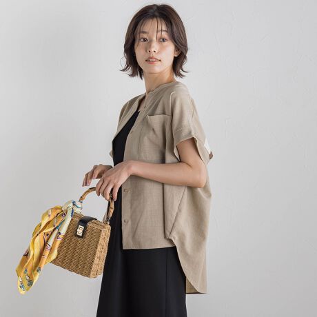 ナチュラルな麻調素材が涼しげな印象を与える、大人のためのデザインブラウス。