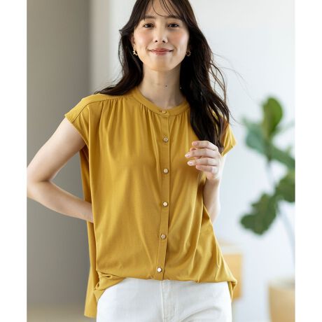 ・カットソーの着心地の良さをそのままに、ブラウスのようなきちんと感をプラスしたバンドカラーのノースリーブブラウス・ネック周りにギャザーを施し、ドレープが綺麗なゆったりボックスシルエット・前裾にスナップがついた2WAY仕様で、留めるとインしたようなニュアンスシルエットが楽しめます・フロントのゴールドボタンがさりげないアクセントに♪・フロント前開きなので軽い羽織としても活躍・落ち着いたカラーの6色展開で、これからの季節に長くお使いいただけます♪