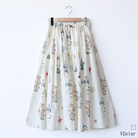 可愛らしいボタニカルフラワーをプリントしたティアードスカート。