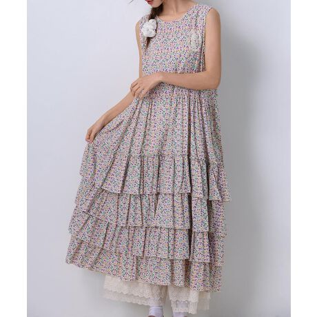 小花柄を全体にあしらった、爽やかでナチュラルな印象のティアードワンピース。段々のフリルデザインがふんわりとしたシルエットを作り、女性らしさを引き立てます。