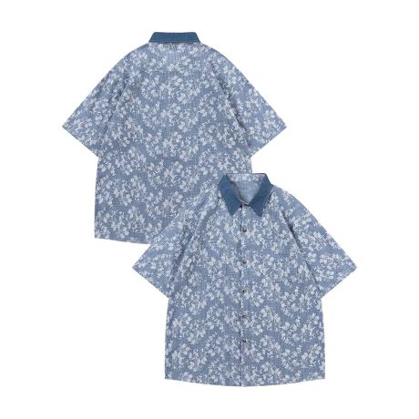 デニム襟ボタニカル刺繍半袖シャツ